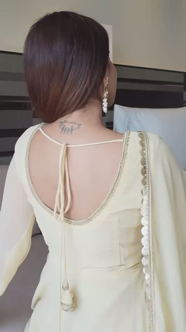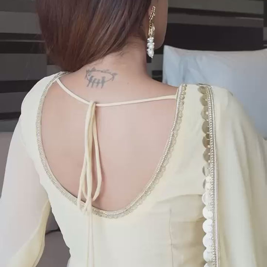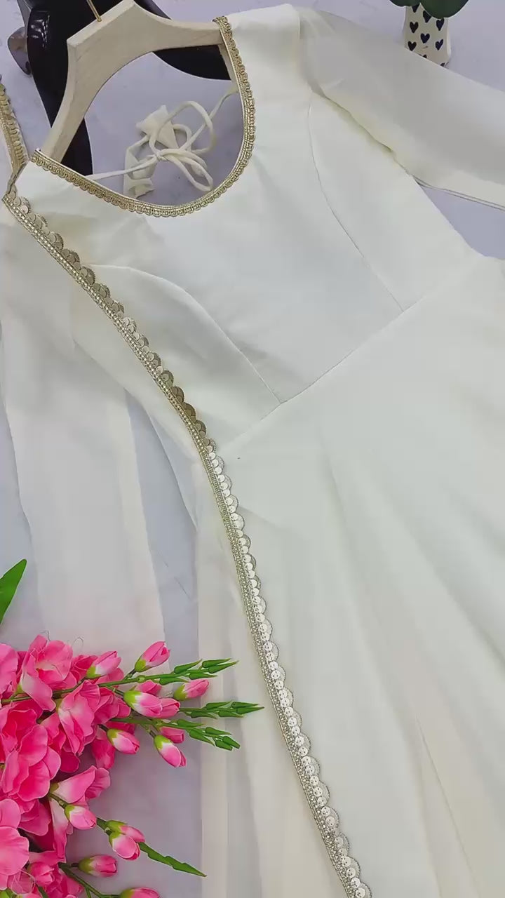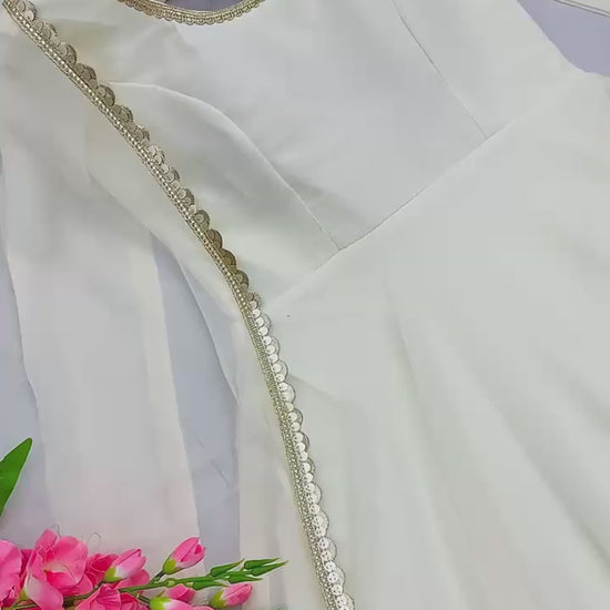 Expertly crafted from heavy fox georgette fabric and designed with a stunning anarkali style and fancy lace details, this fullstitched gown offers a length of 51 inches and a 6.5 mtr flair for an elegant look. Accompanied with a matching pant and dupatta, experience quality and style with this single piece gown.