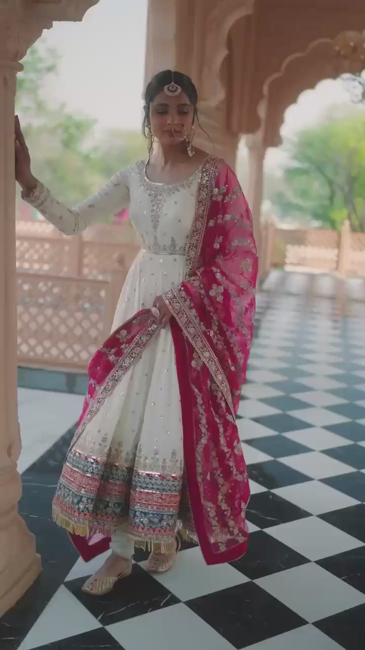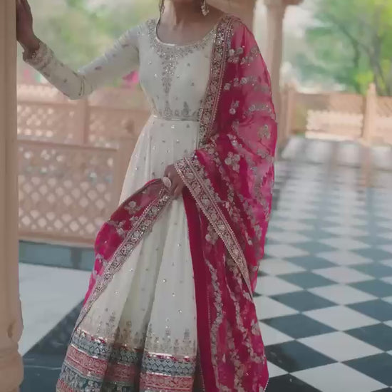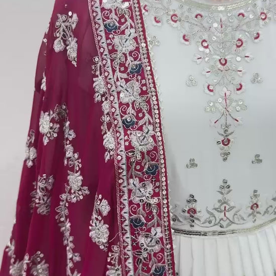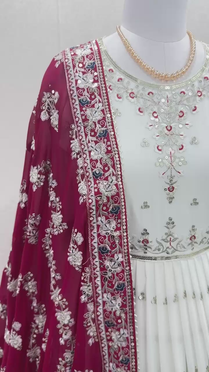 - Floor-length white Anarkali dress with silver embroidery, paired with a rich maroon dupatta, displayed on a mannequin over a traditional carpet.