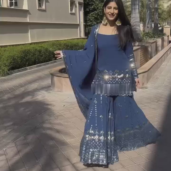 Experience the perfect blend of elegance and style with our Sequins Work Top Sharara With Dupatta. Made with high-quality Faux Georgette fabric and featuring heavy embroidery and 5mm sequins work, our hit design collection offers a luxurious look and comfortable fit. Available in Free Size, with a weight of 900 Kg.