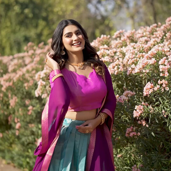 Expertly crafted with Kanchipuram silk and intricate Zari weaving, this South-style lehenga exudes elegance. The drawstring and zip closure provide a secure fit while the canvas stitching and micro cotton lining offer comfort. Complete your look with the georgette dupatta and unstitched blouse showcasing matching Zari work. Package includes lehenga, blouse, dupatta, and drawstring. Weighing only 1.1 kg, this lehenga is perfect for any occasion.